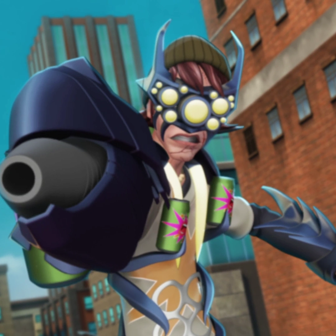 Kirby Link's face was partially covered by the Ultralink's head, resembling a mask. He has three large soda containers on his back and a pair of claws wrapped around his shoulders. His waist is partially enveloped by a blue-colored armor and his right arm features a segmented blue-colored cannon while his left has a forearm pad with a blade. His thighs, knees and feet have additional blue-colored plating.
