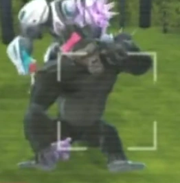Mama Moco is a regular gorilla. She has a small pink ribbon on her head and carries a small purple toy bear.