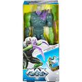 Extroyer has a greenish skin tone, dark purple sharp teeths, a spheric green left eye, crystals protuding from the left side of his head and two preys on each side of his jaw. His armor is completely green and he has purple crystals on his left shoulder and chest and two claws protuding from each side of his mid torso and thighs. He has green shoulder pads with cracks and mantis-like claws for hands, both being purple. He has nine points of articulation and comes with one accessory.