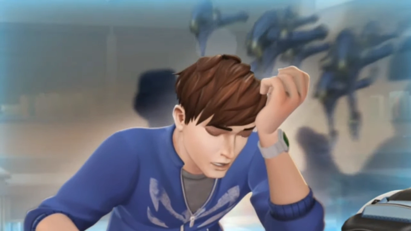 A Makino Destroyer approaches and Blast decides to leave, despite Chomp thinking that they should terminate Max there. Max attempts to go after them, but Steel keeps activating random modes. By the morning, Max goes to school and Steel keeps committing the same mistake, but they eventually manage to use his civilian attire. Meanwhile, Mega-Elementor is talking with Makino, who scolds him for failing multiple times. The trio of the Ultralinks appear and they reveal that they successfully installed the virus and Elementor claims to his master that they had deactivated his defenses. At school, Max is feeling annoyed due to the noise of Dr. Thornhill's marker at the whiteboard. He tells Steel that he is not feeling well since the incident with Blast, and out of sudden he has a vision of his father, along with Takonian soldiers fighting against Makino's forces, which confuses him. Sydney asks him if he is feeling well and Kirby talks with him saying that he could copy his notes. Max has another vision of the Ultralinks, Makino ships and his father almost falling from a cliff, and attempts to help him, shouting to him take care. Everyone watches him in confusion and Thornhill tells him to sit, but he trips to the floor.