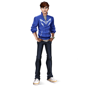 Max wears a grey shirt under a blue jacket with a stylized white-colored Steel logo on his chest, a white watch on his left wrist, black jeans and white shoes. Halfway through the second season, the color of Max's jacket changes to grey.