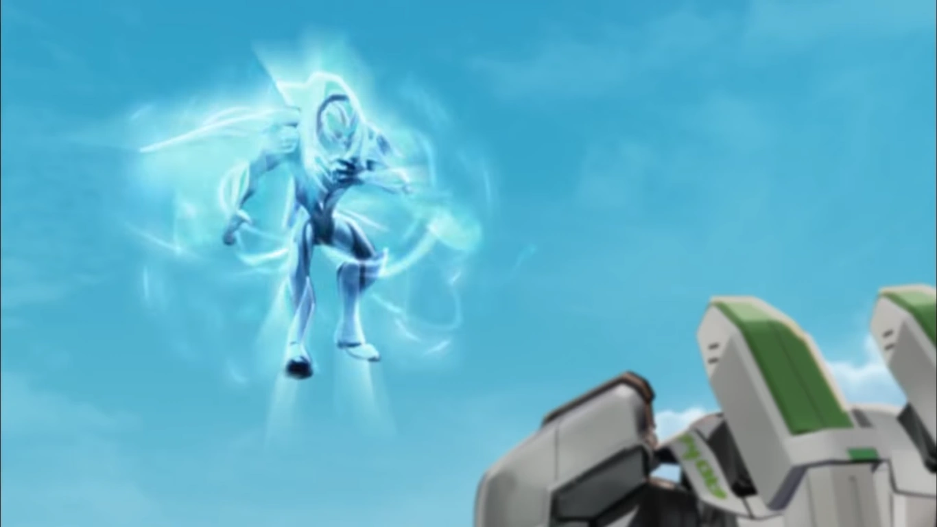 Max slashes other Dread Naughts and realizes that by destroying the N-Tek Link, they could regain control of the organization's systems. He activates Turbo Speed Mode to run after the creature, only to be stopped by Blast and Prism. Jefferson and Kat intervene by shooting the Ultralinks and Max proceeds to go after the alien. He quickly approaches Dread, who creates an energy lash and starts to absorb his T.U.R.B.O. Energy, causing him to revert back to his Turbo Base Mode. Berto sends out the Turbo Lash, which Max uses to hinder the N-Tek Link. In response Dread creates an energy lash and pushes the alien to him. Steel tells Max that Miles was way stronger than them was he had more energy, though he is confident and tells him that sometimes less is more. He deactivates the lash, causing the Ultralink to fly away. While Dread goes after the alien, Max and Steel activate Turbo Flight Mode and split up. They are eventually interrupted by Ven-Ghan, who teleports to the battlefield and is attacked by N-Tek’s tanks. He creates a portal to store the missiles and goes after the N-Tek Link. He prepares to capture the Ultralink and claims that it was now its prisoner and that it would be sent to a trial for his crimes against the universe. After doing so, Dread desperately attempts to intervene, though Ven-Ghan easily defeats them with a capsule containing the tank missiles and then prepares to capture Steel. Max confronts him and the hunter decides to leave, stating that one Ultralink was already good enough. Meanwhile, Berto confirms that N-Tek’s systems were online again yet their stasis cell was offline, which allowed Ultimate Elementor to escape.